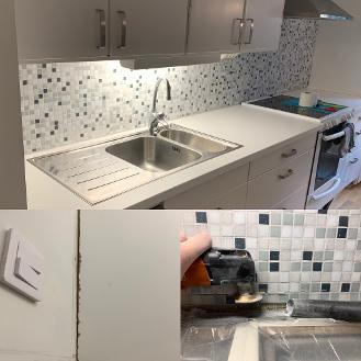 Byte av fuktskadad bänkskiva, anpassning av höjden på bänken samt borttagning av mosaik för att allt ska passa.